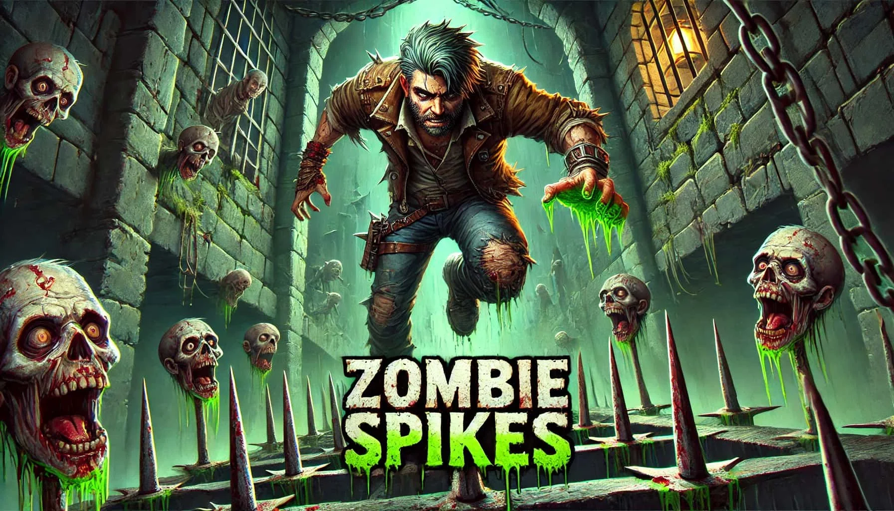 zombie heads drop down into spikes but you must time the upper spikes to kill the zombie heads and allow the hero to esacpe by.